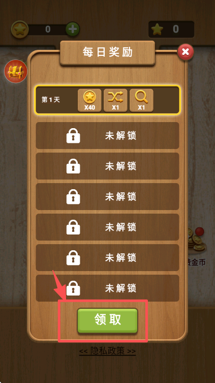 3、在每日奖励界面,点击 “领取” 按钮,获取第 1 天对应的金币和道具奖励。