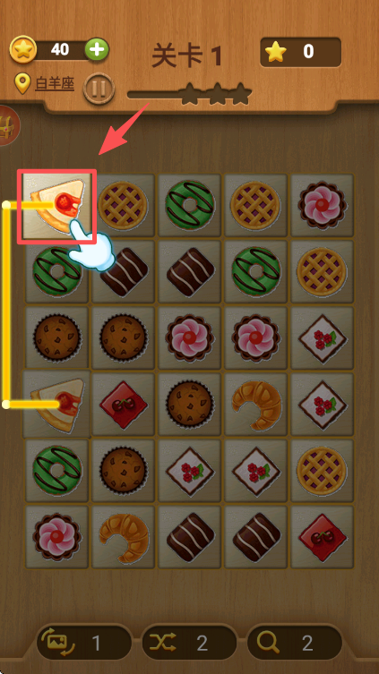 4、进入关卡后,点击相同的图块,如带樱桃的蛋糕,按规则连线消除来推进游戏。