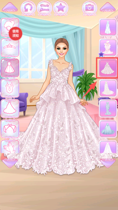 2、进入装扮界面后,点击右侧礼服栏中的对应款式,为角色更换想要的婚纱造型。