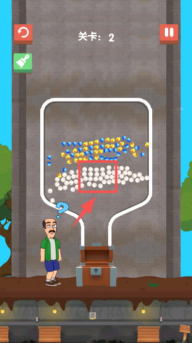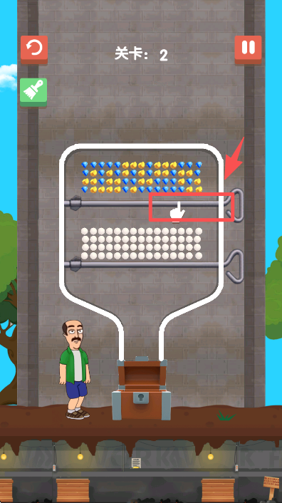 1、在关卡 2 中,按照提示点击上方管道的开关,让物品向下移动至中间区域。