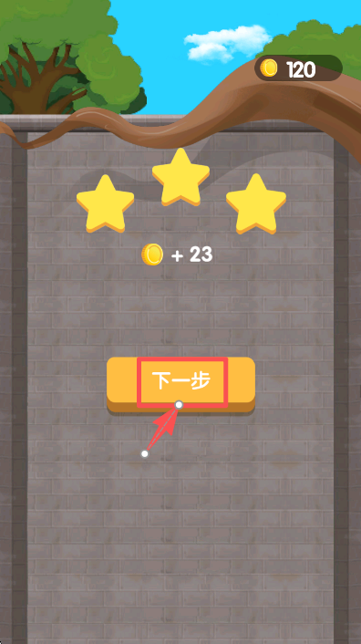 4、关卡完成后,点击黄色 “下一步” 按钮,领取奖励并进入下一个游戏关卡。
