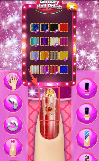 2、在闪粉指甲油选择界面,挑选心仪的闪粉样式,点击目标指甲来完成该闪粉装饰的添加操作。