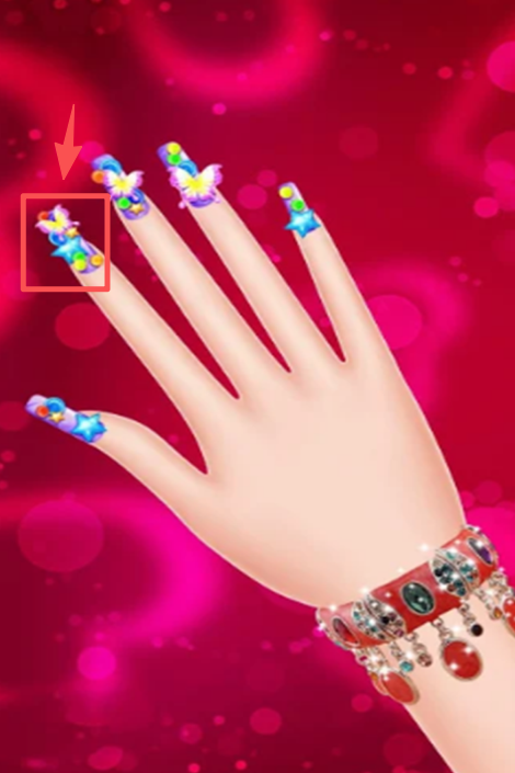 3、在美甲装饰环节,选择星星等装饰图案,点击对应的指甲位置,将装饰添加到指甲上完成装扮。
