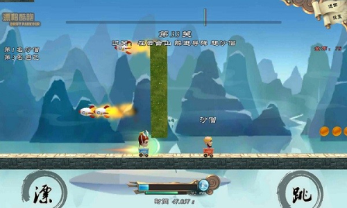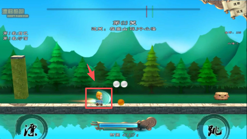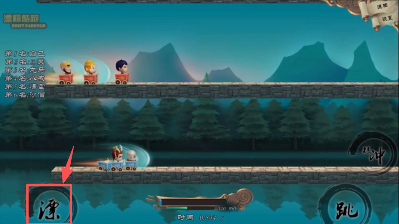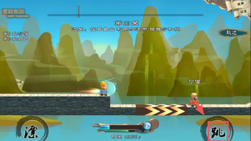 2、当遇到断路或需要超越对手时,点击右下角 “跳” 按钮,控制角色跳跃通过障碍。