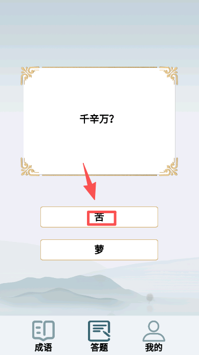 3、在填空页选择标红的 “苦”,完成 “千辛万苦” 的成语填空。