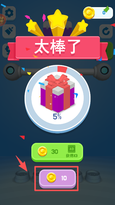 3、点击标红的 10 金币按钮,领取当前关卡的奖励。