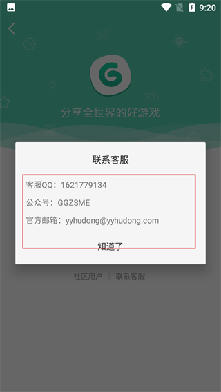 4、在窗口中可查看GG大玩家的客服渠道:客服QQ(1621779134)、公众号(GGZSME)、官方邮箱;点击【知道了】关闭窗口。