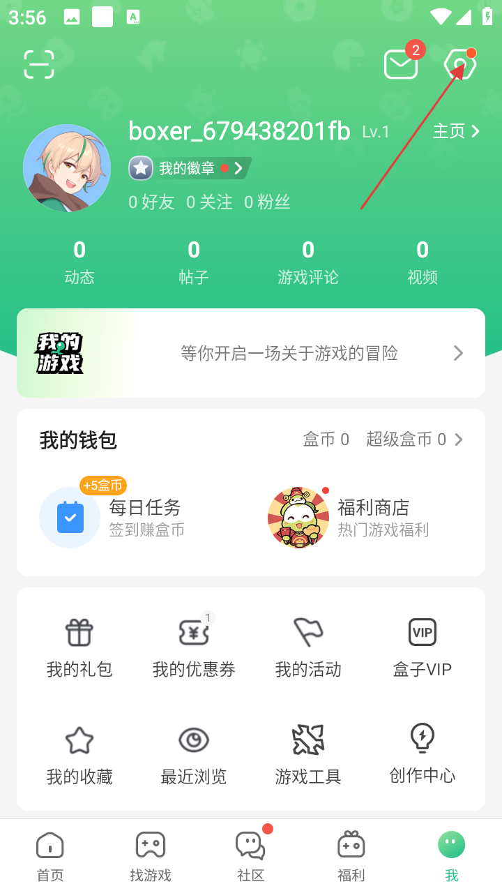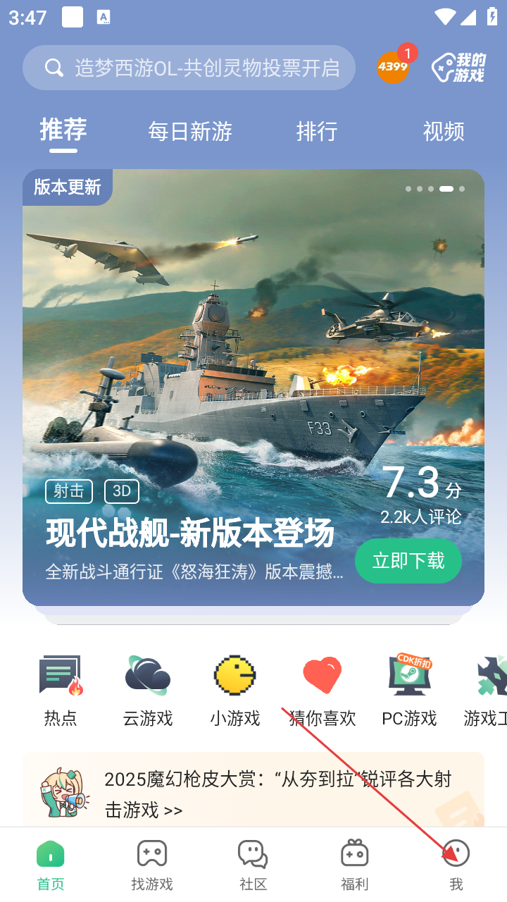 1、首页有推荐游戏、热点等板块,若要进行账号相关设置,点击右下角【我】进入个人页面。
