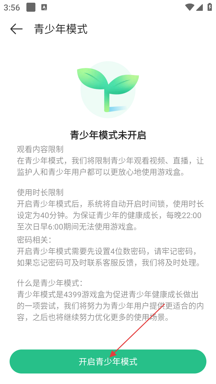 4、在青少年模式设置页面,若要开启青少年模式,点击【开启青少年模式】按钮,按照提示完成后续操作即可。