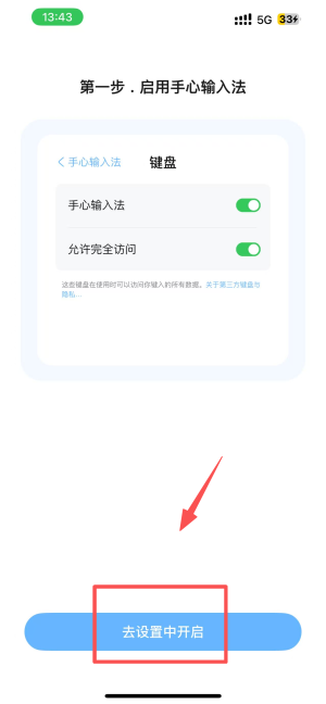 1、启用手心输入法时,点击去设置中开启按钮,在设置里完成启用操作。