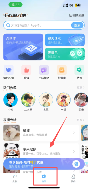 3、进入手心输入法界面,点击趣聊板块,可查看 AI 创作、聊天话术等功能入口。