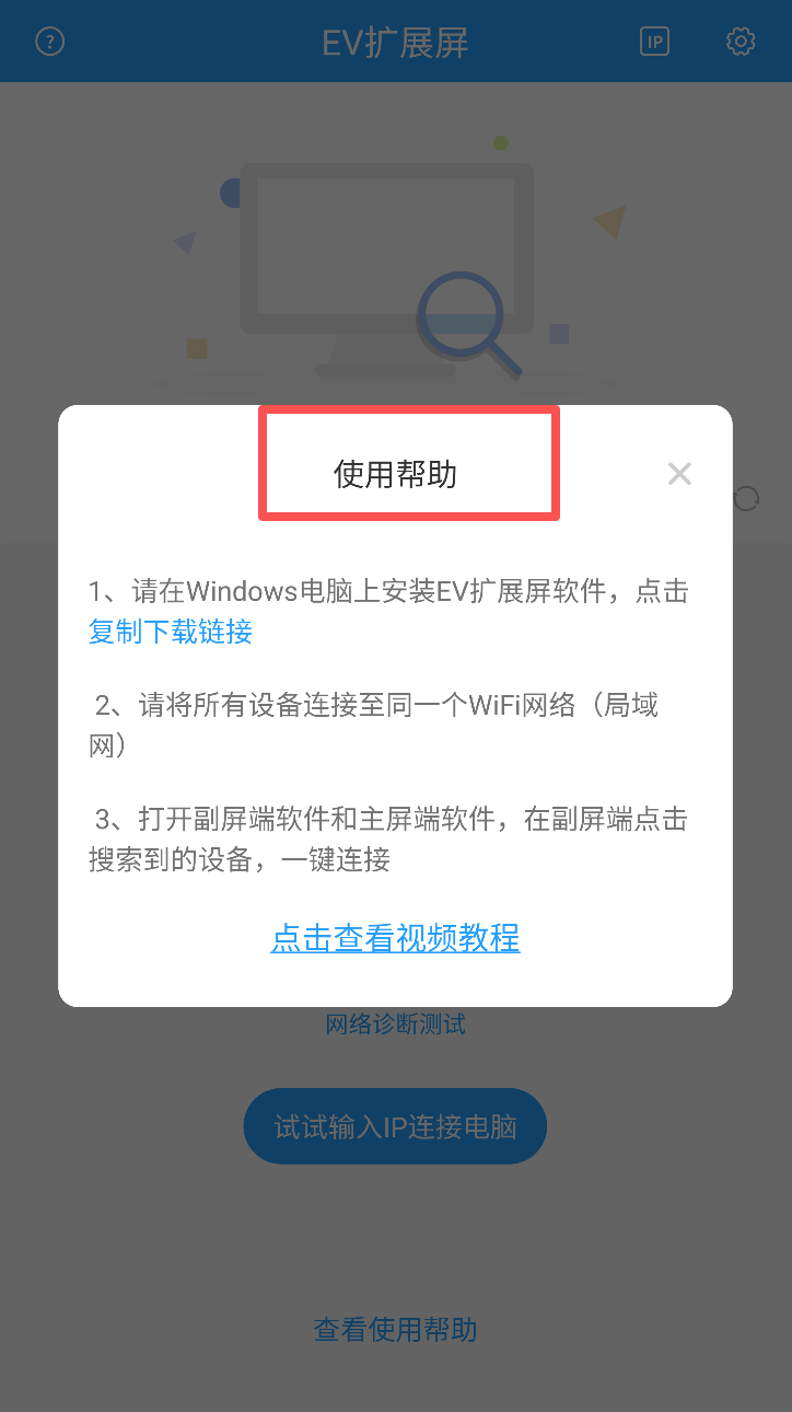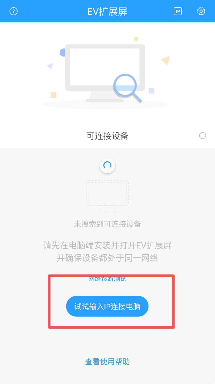 2、进入主界面后若显示未搜索到可连接设备,请先在Windows电脑安装并启动EV扩展屏并保持同一局域网。