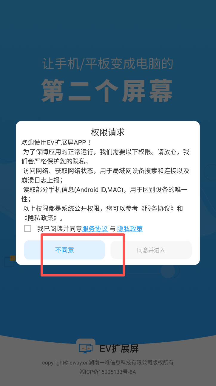 1、在手机或平板上打开EV扩展屏,先阅读隐私权限说明并勾选同意,再点击同意并进入。
