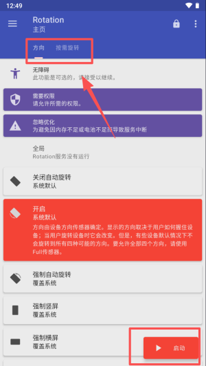 2、在主页点“启动”运行Rotation服务,关闭系统自动旋转并选默认方向。