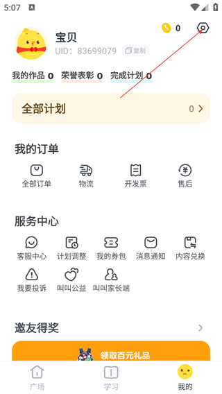2、进入叫叫APP个人界面后,点击右上角设置图标可进入设置界面,界面可查看我的作品、荣誉表彰等信息。