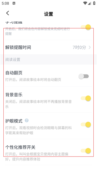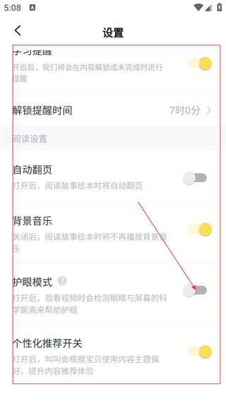 4、开启护眼模式后,可有效保护孩子视力,同时可根据需求管理其他设置选项,提升使用体验。