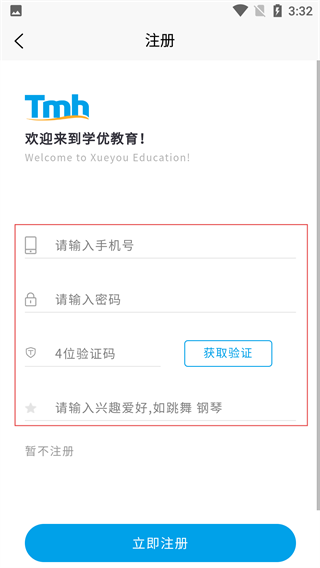 4、在注册页面,依次填写手机号、密码,获取并输入4位验证码,补充兴趣爱好后,点击【立即注册】完成账号注册。
