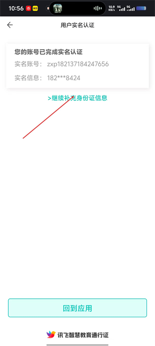 4、页面显示账号已完成实名认证,若需完善信息,可点击【继续补充身份证信息】;完成后点击【回到应用】,返回智学网主界面。