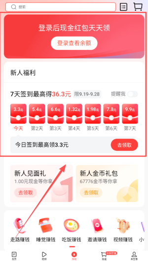 4、今日头条极速版提供了签到赚钱,走路赚钱,睡觉赚钱,吃饭赚钱,看广告赚金币赚钱等多种方式