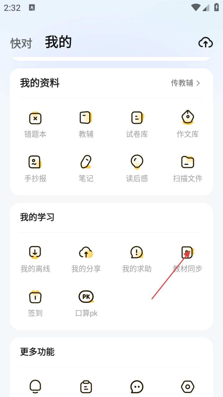2、在【我的】页面,若想同步教材学习,点击【教材同步】选项。