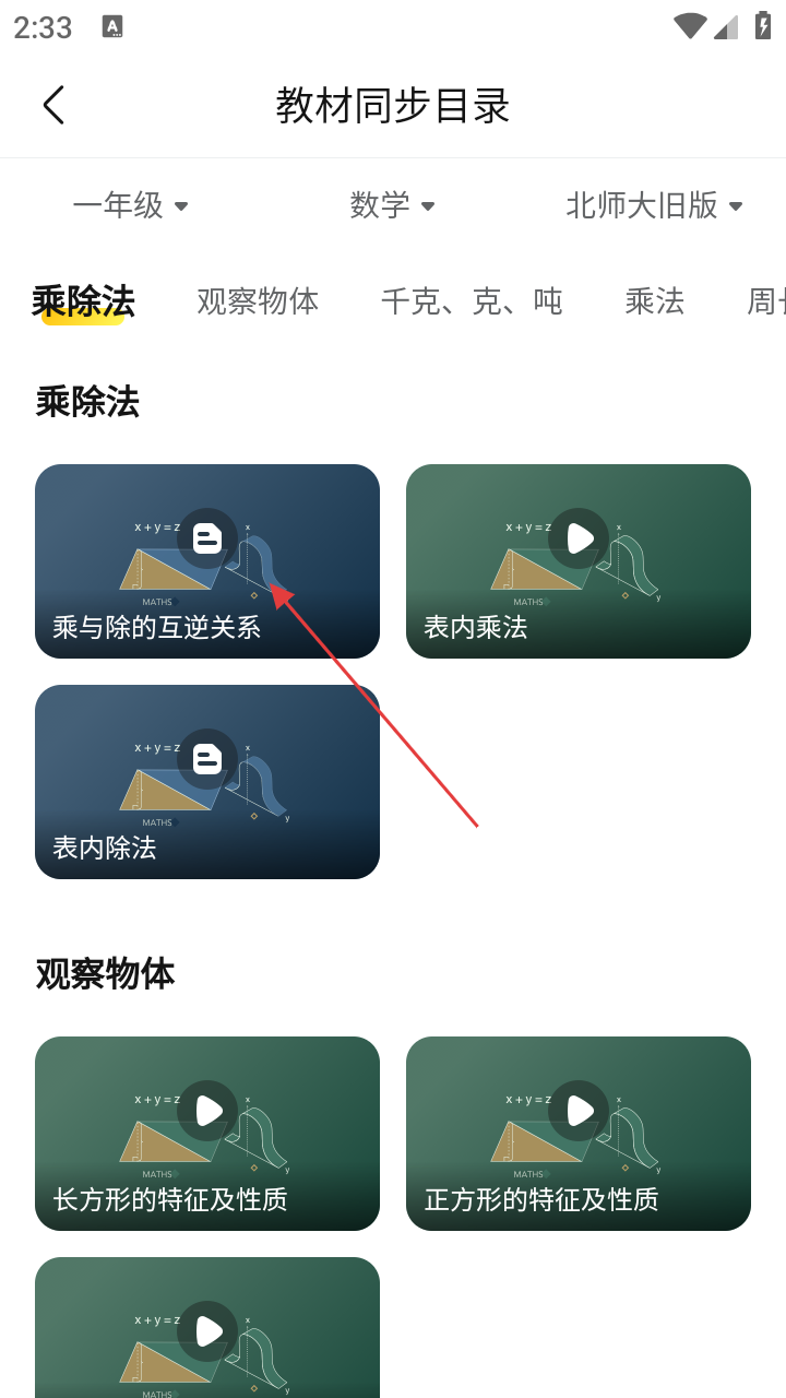 3、进入教材同步目录页面,选择对应年级、学科等,点击想学习的知识点模块。