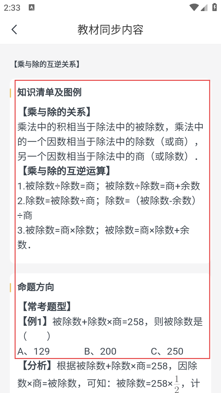 4、进入教材同步内容页面,可查看【乘与除的互逆关系】等知识清单、命题方向等内容学习。