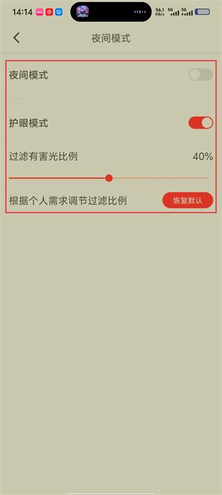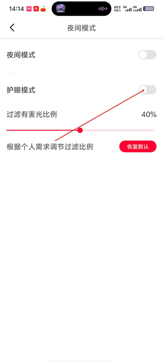 4、开启后可过滤部分有害光线,当前过滤比例为40%,也可拖动滑块调整比例,或点击“恢复默认”重置参数。