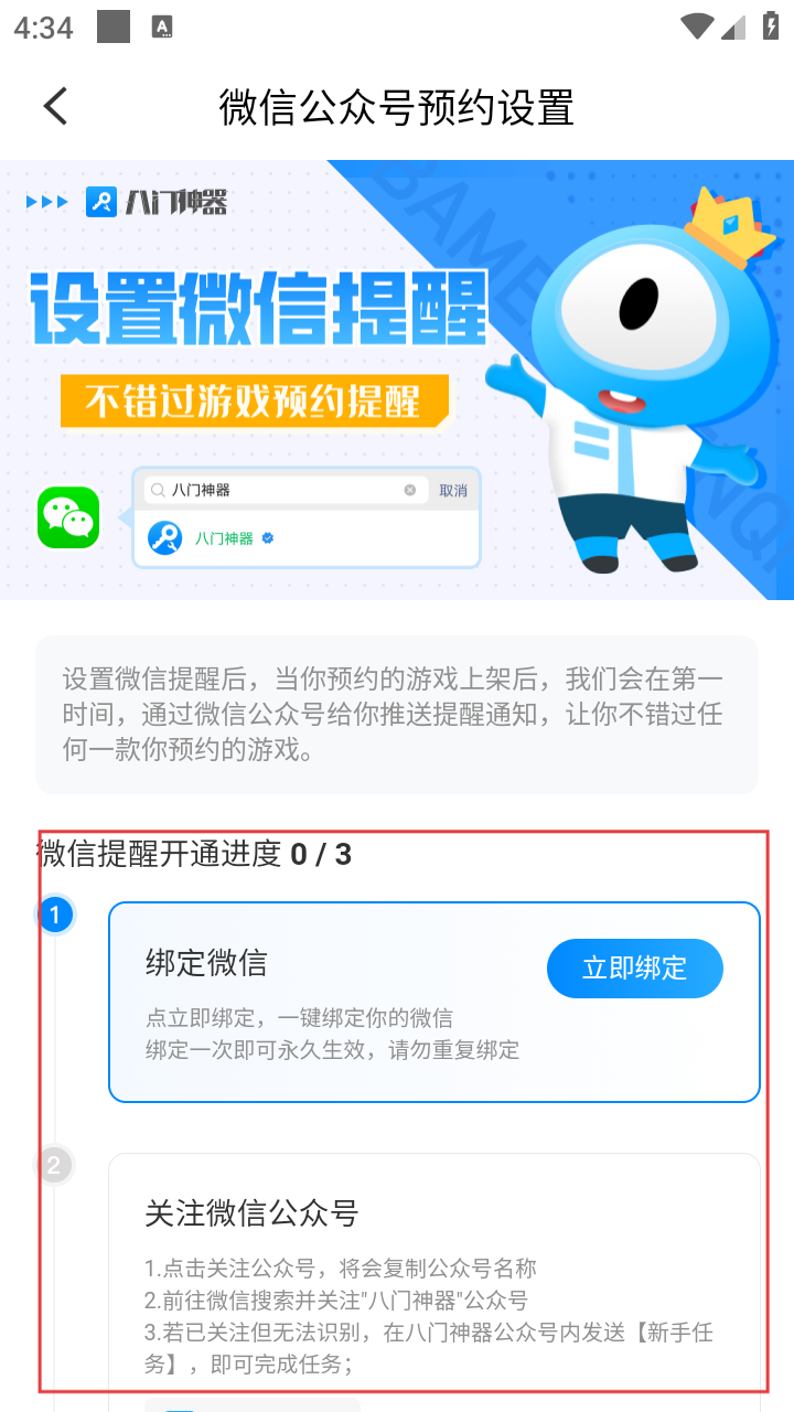 4、在微信公众号预约设置页面,可按步骤绑定微信、关注公众号,完成微信提醒开通,不错过游戏预约提醒。