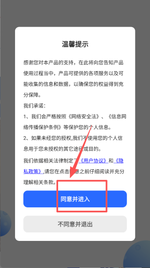 1、点击“同意并进入”按钮,接受隐私政策并开始使用软件。
