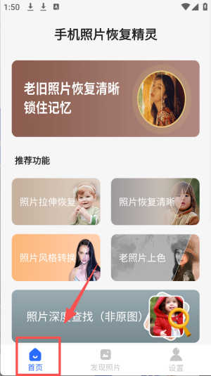 2、在首页选择“照片恢复清晰”功能,开始恢复老照片。