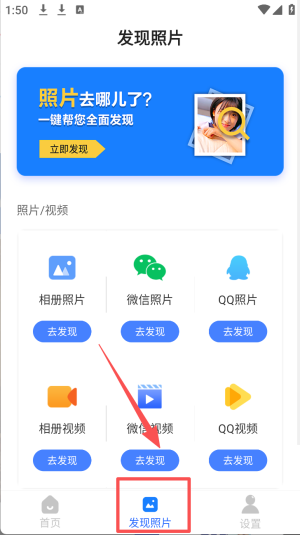 3、点击“发现照片”选项,查找手机中丢失或隐藏的照片。