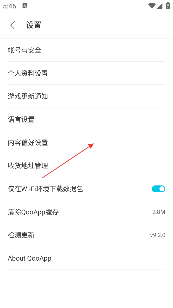 3、在设置页面,点击【内容偏好设置】选项,可进入内容偏好设置界面。