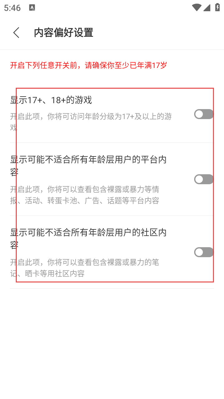 4、在【内容偏好设置】界面,年满17岁可开启【显示17+-18+的游戏】等选项,根据需求开启即可调整内容展示。