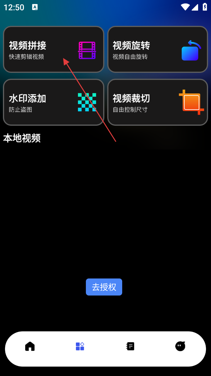 4、使用【视频拼接】等涉及本地视频的功能时,点击【去授权】获取本地存储权限,方可选择视频进行操作。