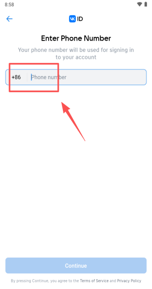 2、填写带区号+86的手机号,同意条款后点击Continue继续。