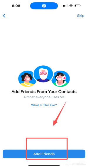 4、进入好友推荐页可Skip跳过,或点击Add Friends导入通讯录。