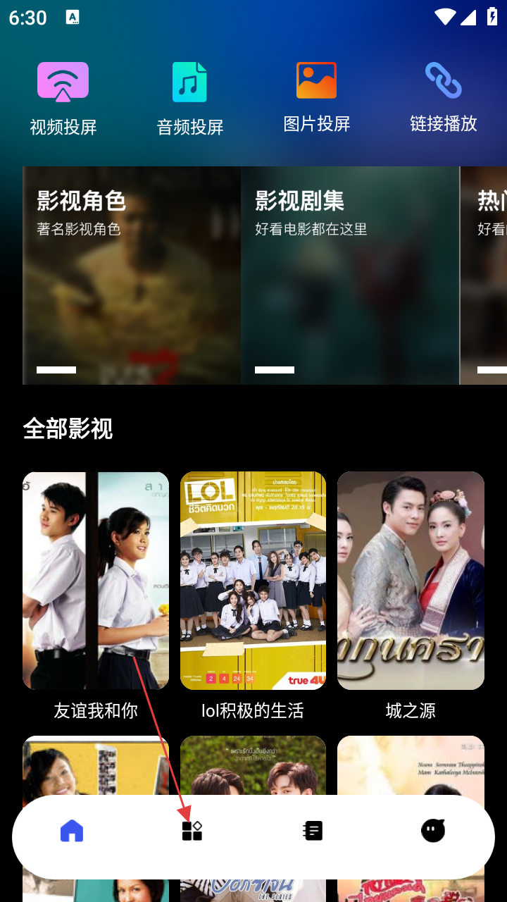 2、进入软件主界面,可利用【视频投屏】【音频投屏】【图片投屏】【链接播放】功能,还可点击底部方块图标进入功能页面。