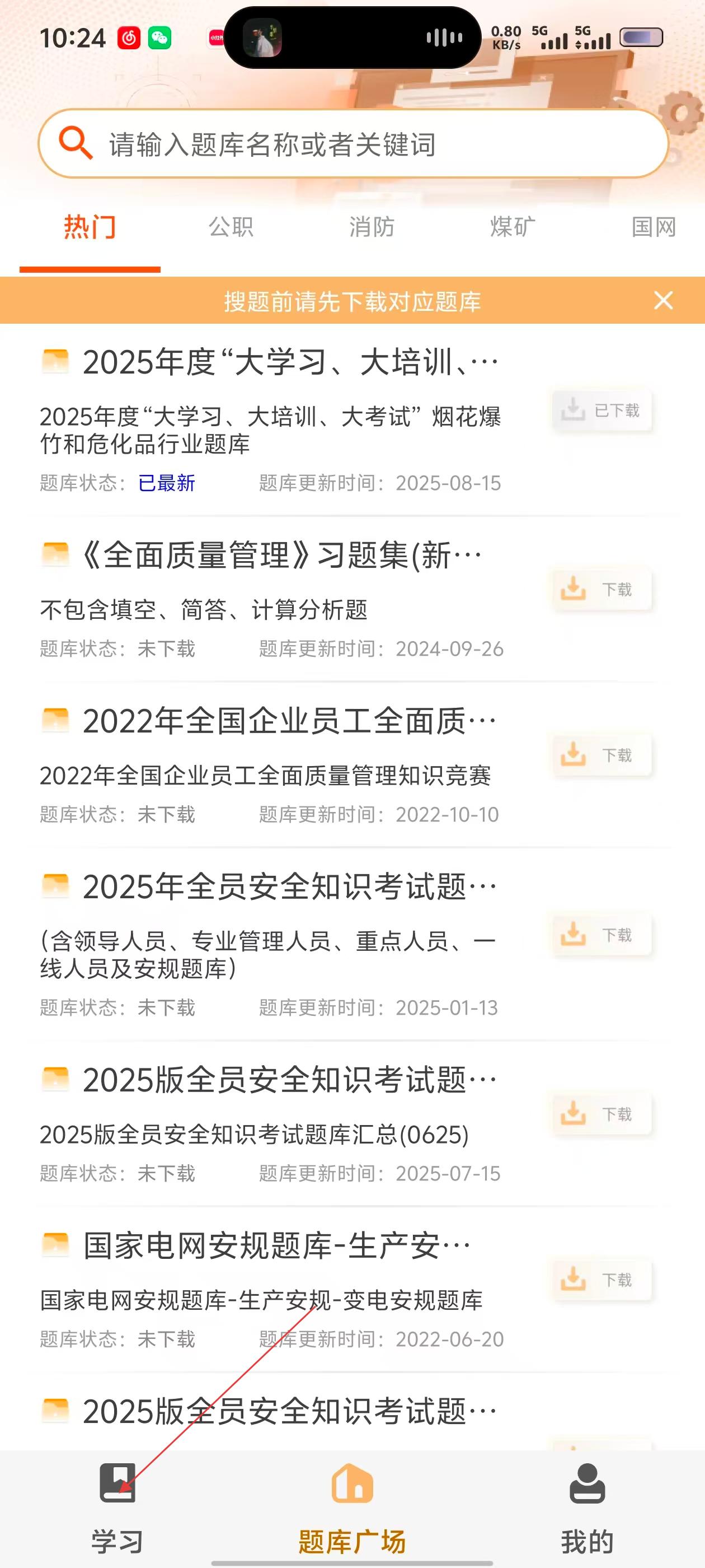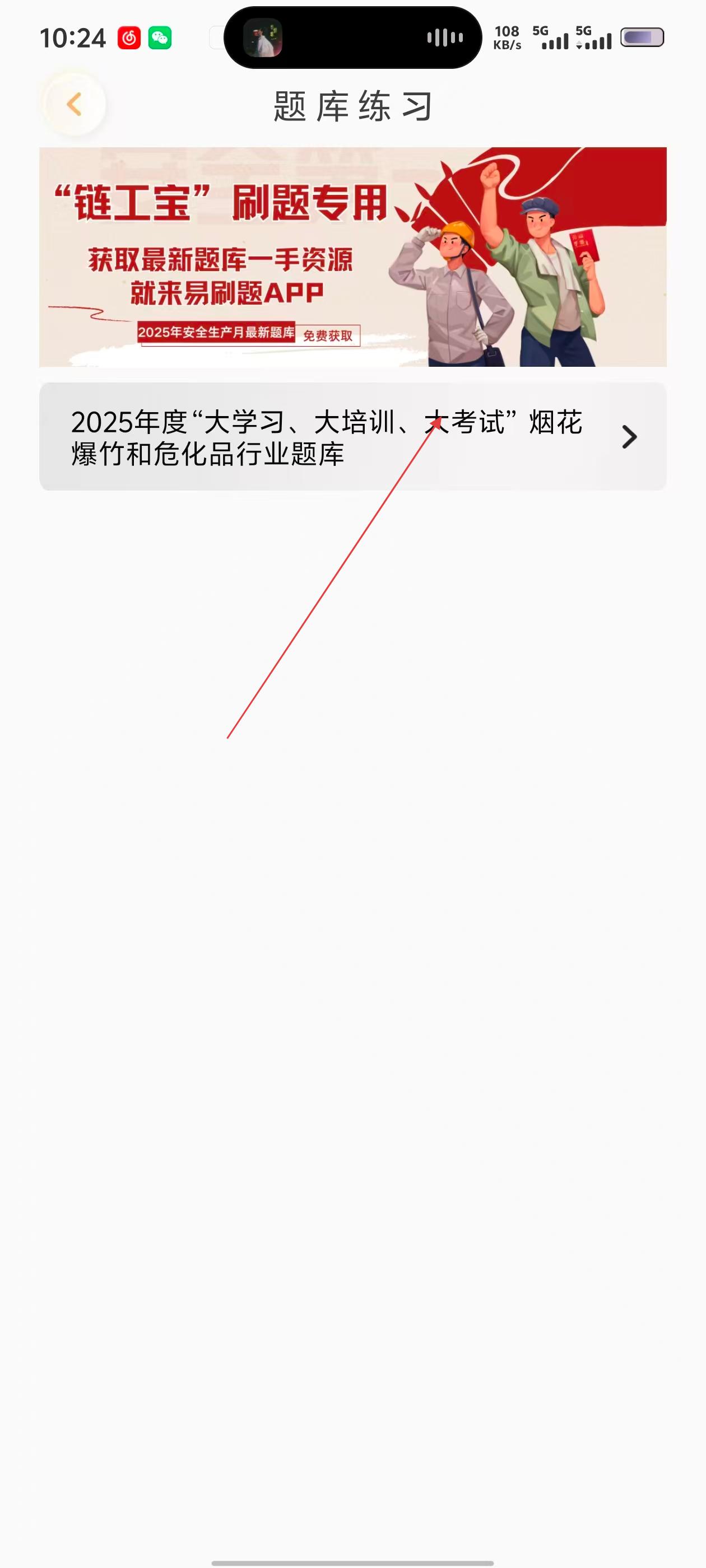 3、在题库练习页面,选择已下载的目标题库,如【2025年度“大学习、大培训、大考试”烟花爆竹和危化品行业题库】。
