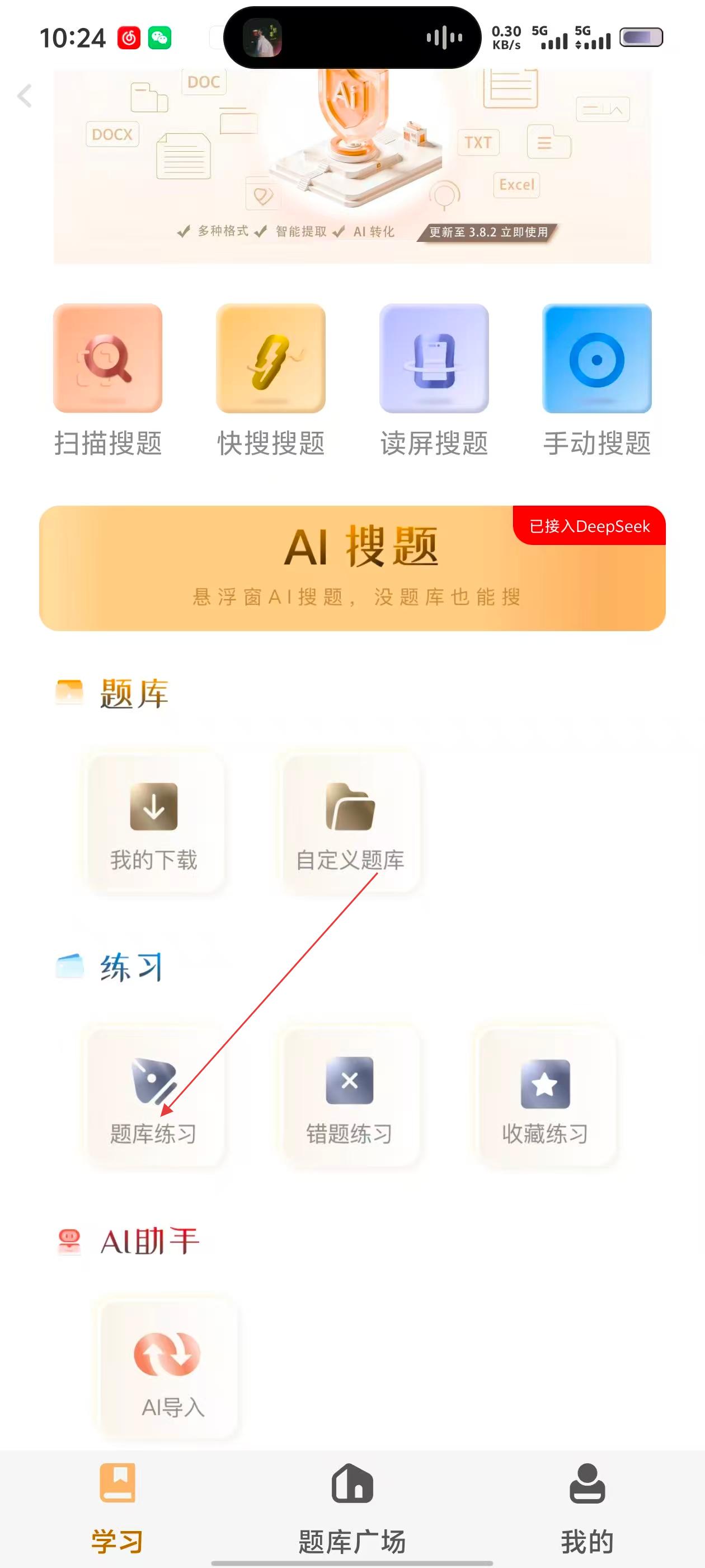 1、在快搜搜题APP题库广场页面,点击底部【学习】选项,进入学习页面。