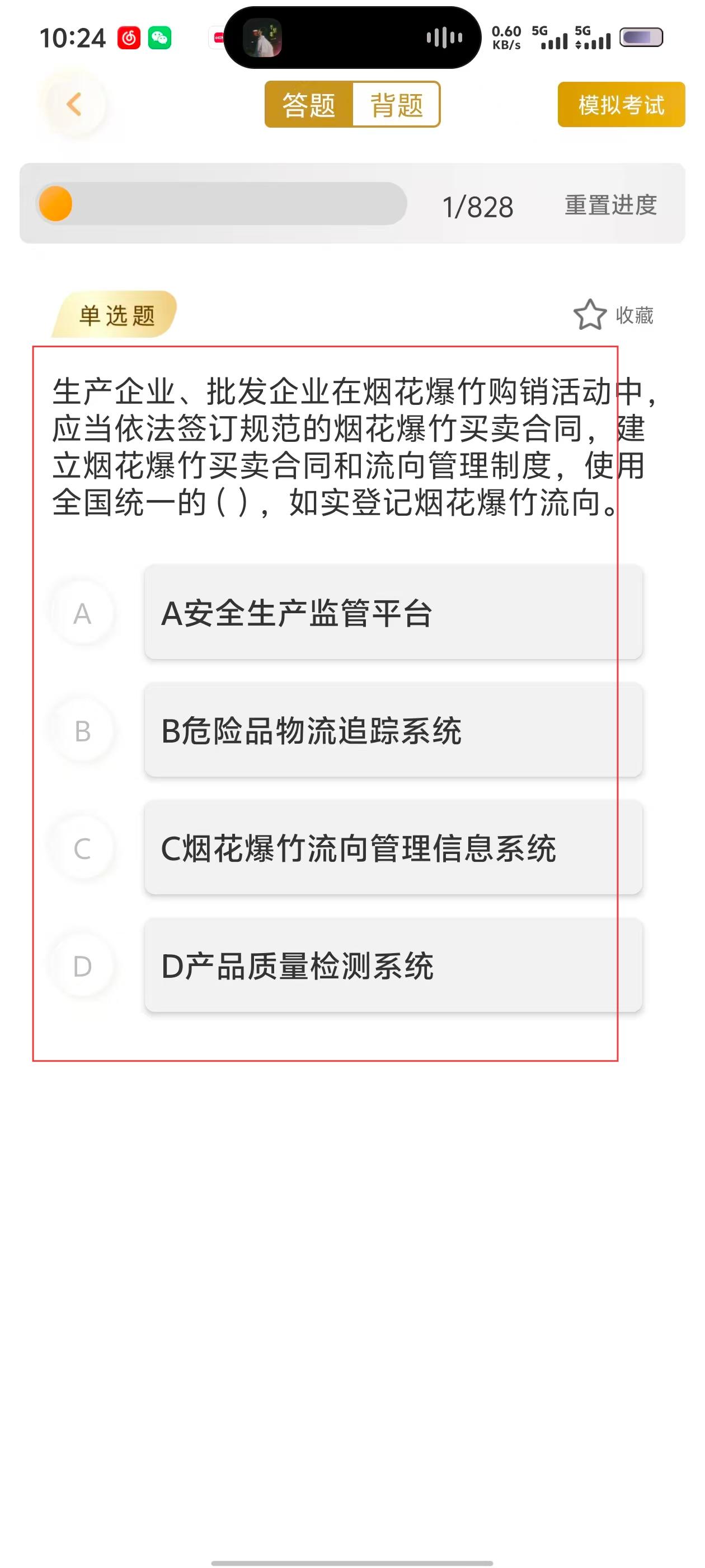 4、进入题库后,即可开始答题练习,页面显示答题进度、题型及题目选项,可根据需求进行答题、背题或模拟考试。