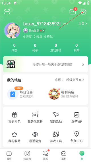 2、在个人中心,点击右上角的设置图标,进入设置页面。