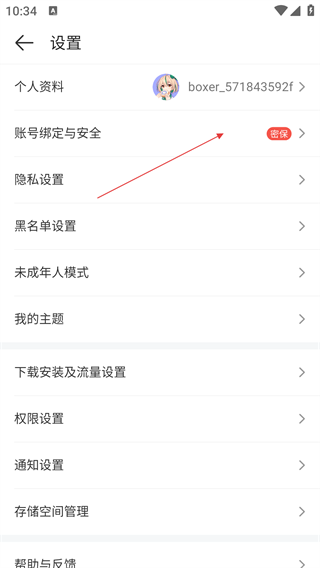 3、设置页面中,选择【账号绑定与安全】选项,进入对应界面。