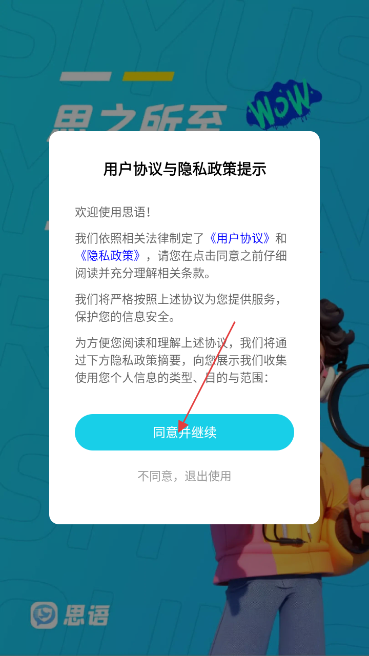 1、首次使用思语,需阅读【用户协议与隐私政策提示】,了解后点击【同意并继续】,进入登录页面。