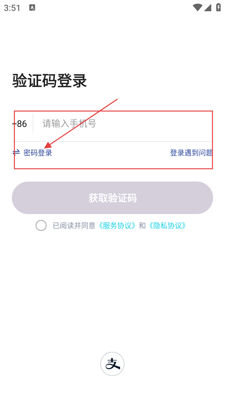 2、在登录页面,若选择密码登录,点击【密码登录】,切换到密码登录界面。