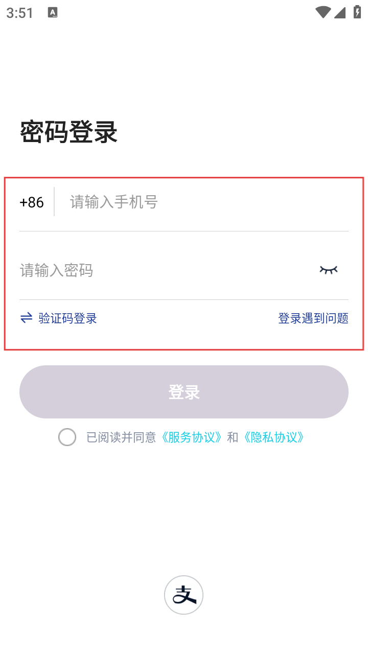 3、在密码登录界面,依次在对应输入框填写手机号码和密码,准备登录。