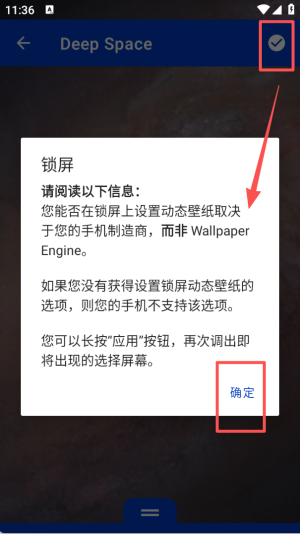 3、点击界面右上角的对勾图标,弹出锁屏相关提示弹窗后,点击弹窗里的 “确定” 按钮。