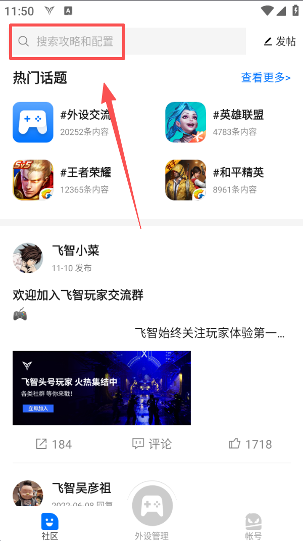 1、在软件社区页面,可点击顶部搜索框,输入攻略或配置关键词,查找所需游戏相关内容。