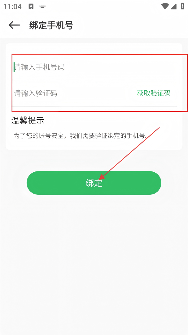 4、在绑定手机号页面,输入手机号码和验证码后,点击【绑定】按钮,可完成手机号绑定操作。