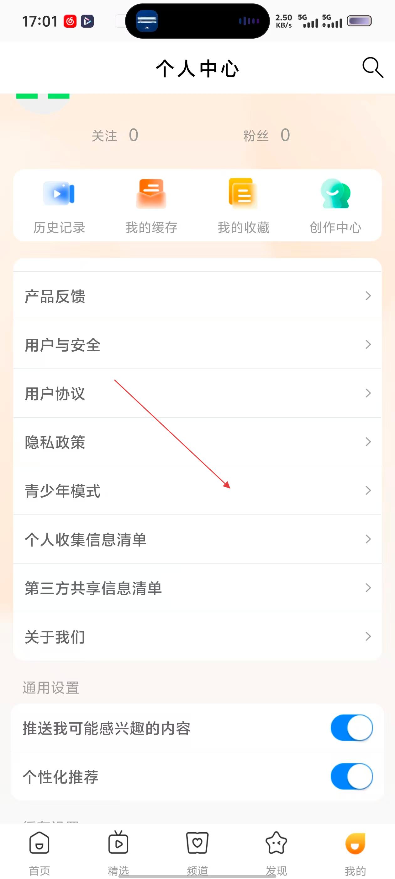 2、在个人中心界面,点击【青少年模式】选项,可进入青少年模式设置界面。