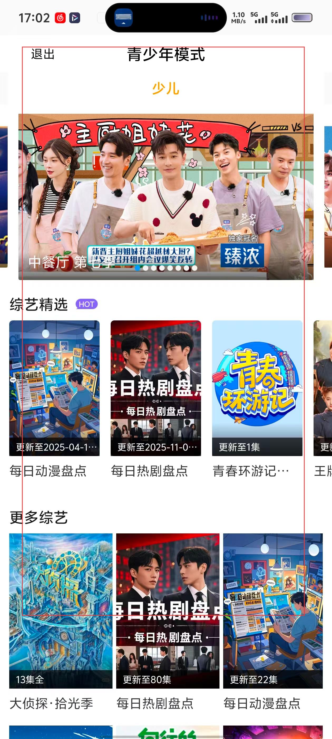 4、开启青少年模式后,将进入青少年模式界面,该界面提供适合青少年观看的内容,有助于呵护未成年人健康成长。